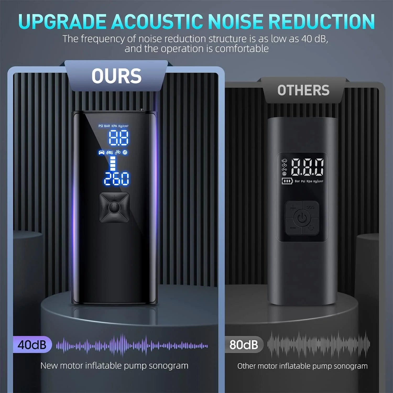 - 【Multiple Practical Functions】More than just a tire pump. There is also a USB-C input port/a USB-A output port, making it an emergency power source for mobile phones or other digital devices. At the same time, the top is equipped with an LED emergency light, which helps to provide convenience for inflating and changing tires in dark places.