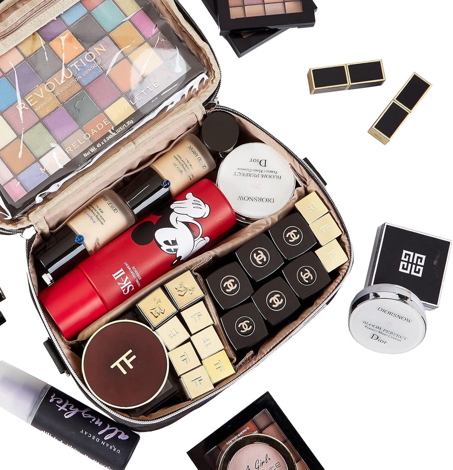 Double Layer Makeup Bag for Travel, Portable Cosmetic Organizer for Brushes Sets, Large Toiletry Holder with Straps, Black